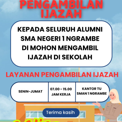 Kepada Seluruh Alumni SMA NEGERI 1 NGRAMBE Di mohon mengambil Ijazah di Sekolah.Waktu : Senin sampai Jumat Pukul. : 07.00 - 15.00Kantor